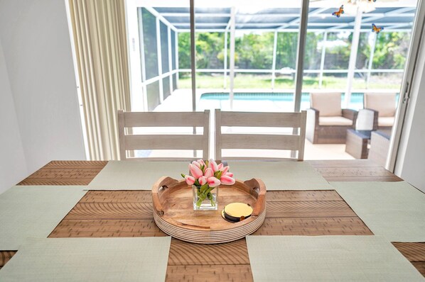 - Screened-in patio with outdoor dining area