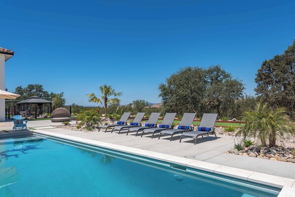 Modern View Estate in the heart of Paso Wine Country, Blue Oak Oasis is over 5400 sq. ft of pure decadence, complete with 5 luxurious bedrooms and 4 full bathrooms and (2) ½ bathrooms. Three en-suite bedrooms, gourmet kitchen, and a fun 1800 sq. ft. game room, complete with pool table, ping pong, poker table, stand-up shuffle board and more. There's also an Xbox along with plenty of table games for entertainment. We take our entertainment seriously!