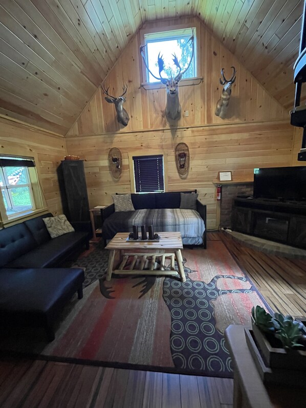 Hytta har en queen size seng ovenpå og en uttrekkbar futon som passer for en voksen eller to barn. Nydelig ny dusj og badekar. Peis med storskjerm-tv med lokale stasjoner (også radio). Ingen WiFi, kabel eller internett. Du kommer ikke til det vakre landskapet for å bo i denne naturlige perlen for å se på tv og søke på nettet. Det er bare for mye å gjøre. Det er god mottakelse ved veien, og de fleste mobiltelefoner vil fungere på hytta, avhengig av leverandøren din.