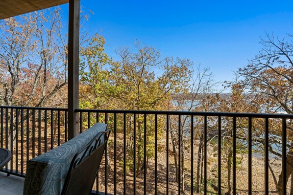 A spacious great room features a fireplace, a full kitchen with major appliances and cooking utensils, and a dining area. The private, covered balcony offers a peaceful view of Table Rock Lake and the beautiful nature of the Ozarks. Guest comfort and experience is our ultimate goal.