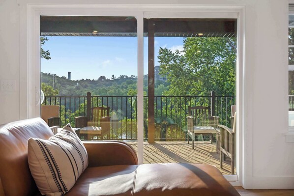 Soak in the views of the lake and the majesty of the Ozark landscape out on the private, covered balcony, with plenty of seating for your whole party to enjoy. Indoors, the open concept allows the outdoors to remain in view through large, picturesque windows. A sophisticated living room is a hub of entertainment featuring multiple seating options such as the plush sofa with two chaise lounges, a mounted smart TV, and electric fireplace ideal for cozying up during cooler nights.