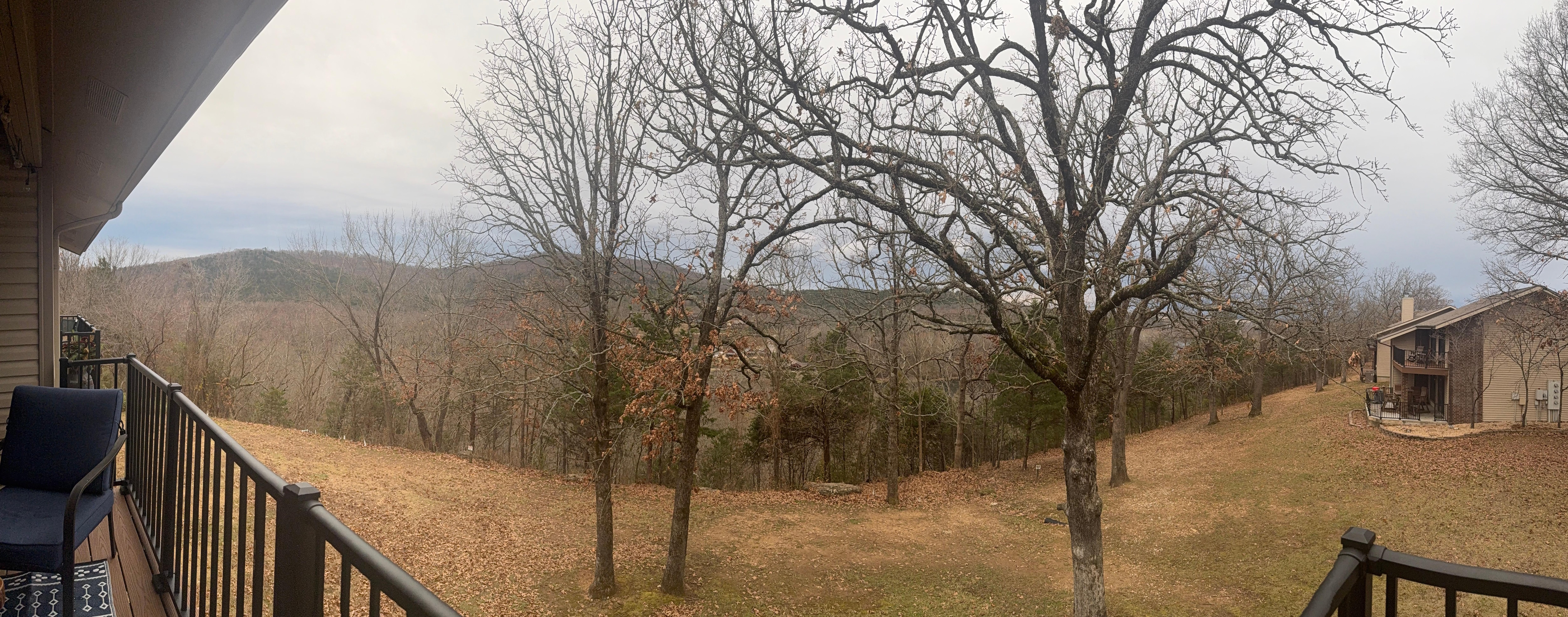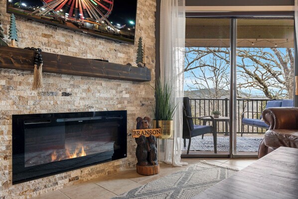 Located in the highly desired Pointe Royale Resort Community, this newly renovated with Quartz counters throughout, fresh paint, mural by local artist and high end finishes throughout boasts of 2 bedrooms with double Kings, 2 bathroom condo boasts of privacy tucked away in the trees on lake Taneycomo with a view of the lake and mountain view and no neighbors behind, yet so close to the action. The clubhouse is walking distance, less than 5 min all flat walking, and less than 10 min to everything Branson has to offer. The view of the lake is best seen in the winter months, during the summer you'll feel like you're tucked away in the trees. The soaring ceilings highlight the view and space and with extra privacy of having no neighbors above you. Since this is a top floor unit, there are approx. 15 stairs to get to the front door. The space has just been tastefully decorated to make you feel like you are truly on vacation. Master bedroom has a super comfortable king size bed, large walk in shower and balcony that leads to the amazing view. Secondary bedroom has King size bed. Both bedrooms have blackout curtains for ultimate relaxation. Couch has pull out memory foam queen, and a pack n play, sleeping a total of 7. Both bedrooms and living room have Smart TVs and cable. The condo is stocked with family friendly amenities including kids table and chairs, toys, coloring books and markers, a pack and play, highchair, and toddler air mattress. Large covered porch has seating for 6 to enjoy the amazing view with a cup of coffee, glass of wine or a meal. Kitchen is fully stocked including kid friendly dishes, cups and plasticware! Several staple needs will be available to you during your stay; cooking spray, salt and pepper, seasoning, aluminum foil, coffee filters and ground coffee, Keurig pods including Tim Hortons pods (Canadian coffee), laundry detergent, dryer sheets and dishwasher pods. The basics also include toilet paper, paper towels, dish and hand soap, kitchen sponge, shampoo and conditioner and trash bags. It is setup to truly just bring your suitcase! We offer you a complimentary bottle of wine to welcome you to Woodsy Wonder! Swim towels are provided which makes one less thing for you to pack, also available are a 4 tennis rackets and tennis balls, 4 pickle ball rackets and balls, a basketball, football and soccer ball and air pump. We also stock kids coloring books and markers. There is a large grassy area directly outside the condo to enjoy with the kiddos, or take the basketball and rackets over to the clubhouse court. There are also several family friendly games like corn hole and giant Jenga as well as board games, card games and books available to help you enjoy your stay. Pointe Royale has amenities galore which inlude an Indoor and 2 outdoor pools, kiddie pool and hot tub, 2 playgrounds and Tennis courts, pickleball, basketball hoops and fitness center and restaurant. The Clubhouse and main indoor and outdoor pools and fitness center, basketball court, tennis court and pickleball court are walking distance, less than 5 min walking, and is all flat. Access to the Pointe Golf Course. Location is on Lake Taneycomo with access to the lake for fishing as well as a pond on site that doesn't require fishing license. There is pool side food and drink at the Tiki Bar, service during summer season and a restaurant on site all year around. This location is PRIME! You are less that 5 min to Table Rock Lake, 10 minutes to Silver Dollar City, Branson Strip or Branson Landing. "The Pantry" store is huge and is conveniently located 1 min outside of Pointe Royale and is great for getting those last minute needs whether its groceries, snacks or any kind of drinks. We are also next door to a "We Proudly Serve Starbucks" with a very robust menu. We hope you to feel right at home!