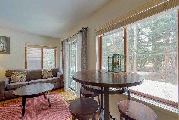 Lys, lyst, rent og praktisk. Mountain Sunsets er en 1 soverom, 1 bad Wildwood Suites Condo og kan komfortabelt sove 4 personer med en queen size-seng på soverommet og en queen size sovesofa i stuen. Du er velkommen til å ta med din furry venn også da denne leiligheten er hundevennlig (tidligere ordninger må gjøres). Kjøkkenet har blitt pent ombygd med granitt og rustfritt stål og er fylt med alt du trenger for å tilberede måltider under ditt besøk. Sitt på verandaen og hør på de rolige lydene av elva om sommeren. Denne leiligheten i første etasje har også rask og enkel tilgang til felles badestamp. Nyt ski inn og ut tilgang om vinteren med Snowflake skiliften er bare om en 5 minutters spasertur til fots og gå tilbake til komplekset via Four O'clock skibakkene rett ved Sawmill Rd, men det er også en gratis skyttelbussen stoppe nær av. Lett gangavstand til byen også. Leiligheten har flatskjerm-TV i stuen og en DVD-spiller. Mountain Sunsets (Wildwood Suites 107) vil være en leilighet du vil ønske å returnere til år etter år. En parkeringsplass er tillatt for en 1 roms leilighet. Hvis du ønsker å ta med hunden din, er det en nattlig avgift. Vennligst ring vårt kontor for ordninger.