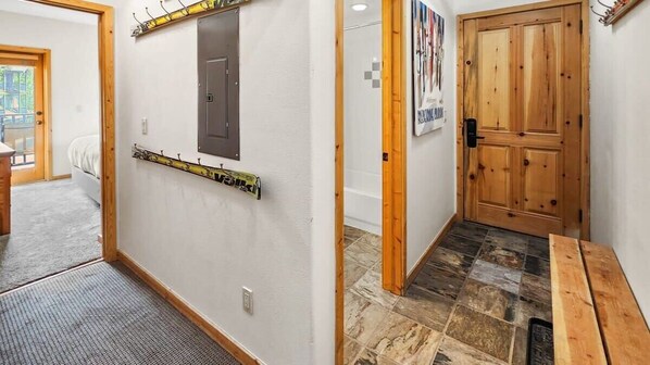 The townhome’s other two bedrooms are found on the lower level of the home, providing a nice separation of space for additional privacy. The first bedroom is set up as a bunk room with two twin-over-twin bunk beds in wooden bed frames. This room features a smart TV, fun decor with colorful lighting and artwork, and ample storage space with a closet, a small dresser, and drawers underneath the beds. In addition, from this room, you can step out to a deck that is shared with the other downstairs bedroom. The second downstairs bedroom is a cozy space with a queen-size bed, a large dresser, a smart TV, and access to the downstairs deck. All three of the home’s bedrooms feature carpeting for added comfort. A full bathroom is located next to the two downstairs bedrooms for shared use and features a single-sink vanity and a bathtub/shower combo. Next to the bathroom is a tiled hallway that leads to the garage. In the hallway, you will find a bench and coat hooks, making for a comfortable space to unload your outdoor gear before settling into the home.
