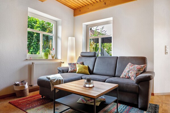 The holiday apartment Inge Huus in Hude offers everything you need for a pleasant stay. The accommodation extends over two floors and includes a living room, a well-equipped kitchen, a bedroom, a bathroom, and a guest WC. It accommodates two people. The second floor is accessible via a stair lift. Amenities include high-speed Wi-Fi (suitable for video calls) and a TV. The private outdoor area features a garden and an open terrace. Public transport is within walking distance.