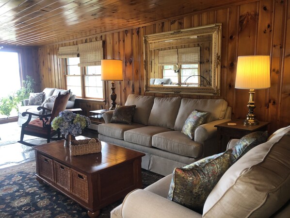 Opplad for en uke på denne elegante og avslappende Maine hytte, med en fantastisk utsikt og tilgang til Long Lake sett fra stue, spisestue, kjøkken og veranda. Du vil bare nyte en 150 meter spasertur over plenen til sjøen for å få tilgang til ditt rene, sandbaserte svømmeplass og steinmur med en trehog hvor du kan bølge til folkene på elven dronningen mens de går forbi.