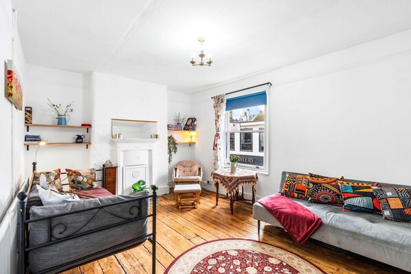 Welcome to Simply Boho, a spacious two-floor apartment set right in the heart of Brighton’s iconic North Laine district. Positioned above Sydney Street, this vibrant city stay quite literally places you in the middle of the action, independent cafés below, live music drifting through the air, and Brighton’s creative energy right outside your window. Spread over two floors, the apartment comfortably sleeps up to 4 guests in one bedroom, with a living room and kitchen area. Making this space ideal for couples, friends, or small families wanting to stay central.