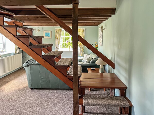 Første etasje: Stue med bjelker. Kjøkken. Separat toalett. Åpne trappesteg til første etasje: 1 dobbeltrom (5ft) soverom (zip og link, kan være 2ft 6in enkeltsenger på forespørsel). Bad med dusj over badekar og toalett.