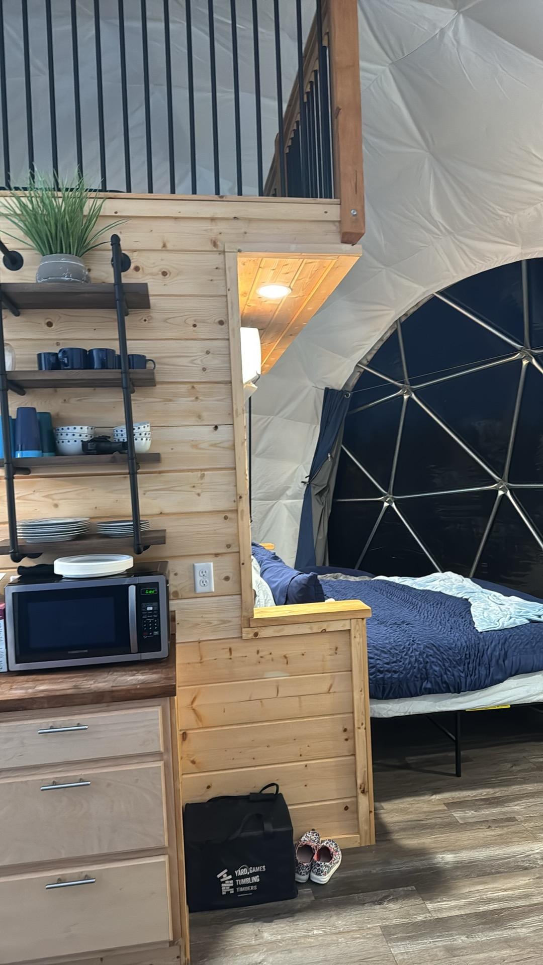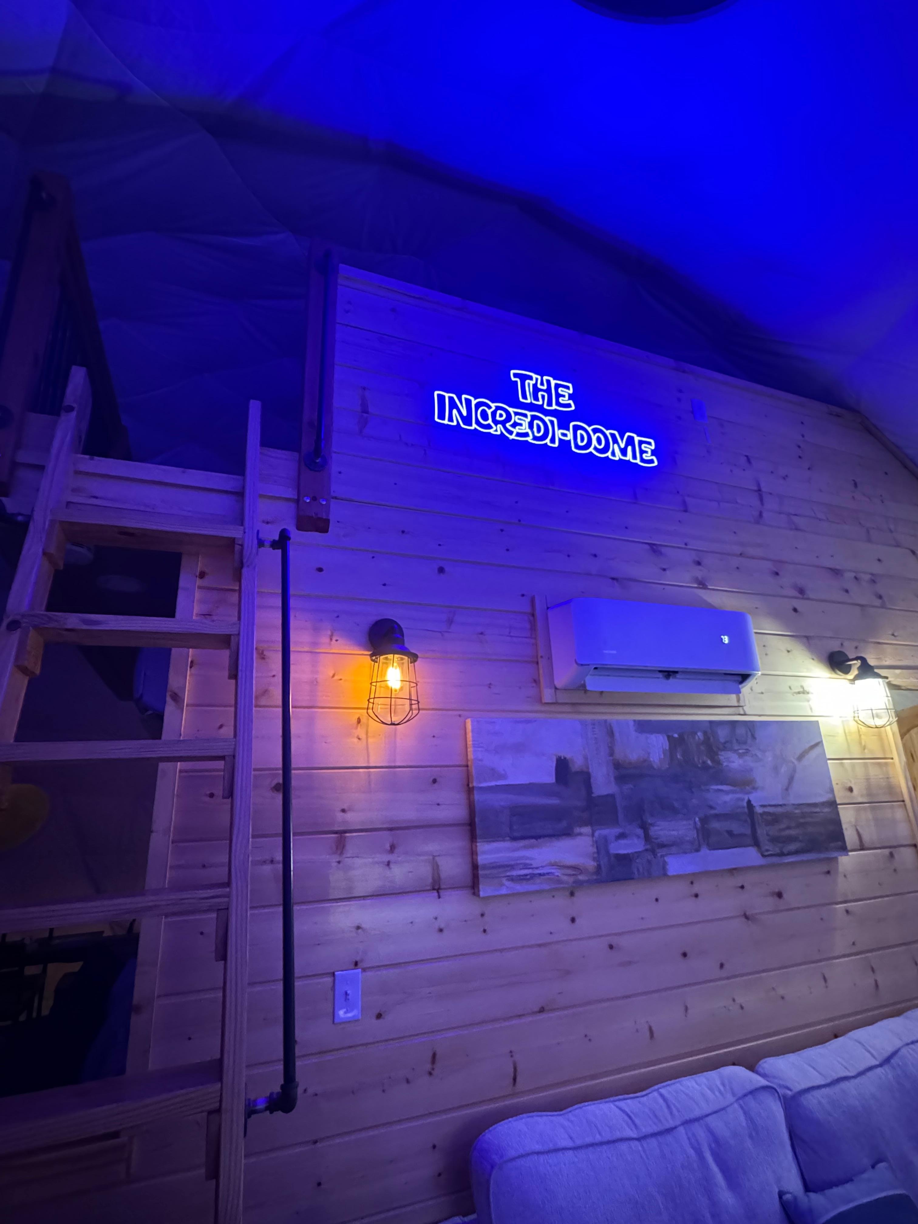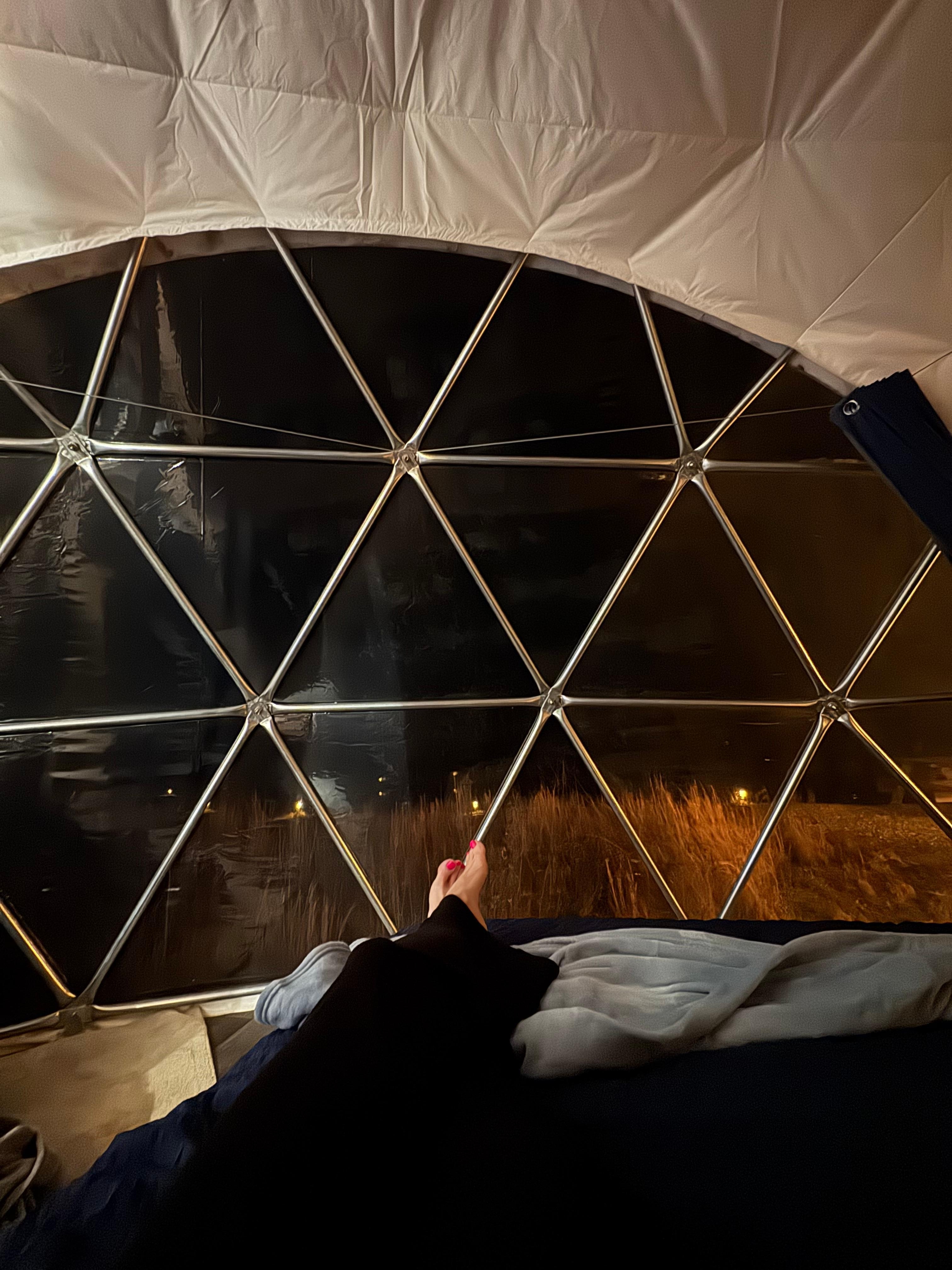 Step inside our geodesic dome and be greeted by a spacious and inviting interior. The open-concept design creates a sense of airiness and allows natural light to flood the space, highlighting the dome's striking architecture. The cozy living area is perfect for relaxation, creating a warm ambiance on cooler evenings.