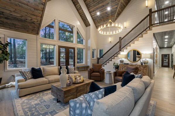 The outdoor space at Black Bayou is a paradise in itself, with a myriad of amenities to enhance your stay. From the Big Green Egg and flat top griddle to the custom fire pit and gas fireplace with a smart TV, every moment spent outdoors is an experience to savor. Turn up the competition with our washers set, custom corn hole, giant Connect 4 or Hook 21 Ring Swing. Unwind in the hot tub, taking in the breathtaking vistas of the surrounding pine trees and rolling hillsides, creating an ambiance of serenity and relaxation.