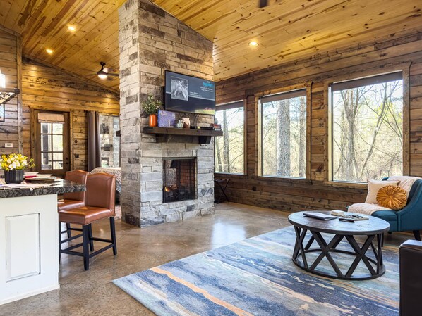 Denne vakre nye luksushytta sto ferdig i 2020. Det er det perfekte stedet å komme seg unna folkemengdene og slappe av omgitt av natur. Høye hvelvede tak med rikelig med vinduer holder trærne og dyrelivet i sikte, mens det komplette kjøkkenet gir et sted å slappe av rundt den store sentrumsøya. Bakdekket er det perfekte stedet å nyte morgenkaffen, se på TV og slappe av i det tildekket boblebadet. Store HDTV-er er i stuen og soverommet.