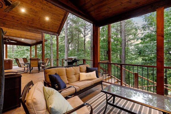 Even though we have plenty of games and indoor activities, you can also take your gathering outside and enjoy the 6-person hot tub, large covered porch, with a gorgeous outdoor fireplace and plenty of seating for outdoor meals. We have a ping pong table (doubles as a large dining table), ready to be used on the back porch. Kids and adults love playing outside on our private 2+ acres with room to roam ... you will find a kids’ play set, fire pit and outdoor games: corn hole, ladder toss, darts, tether ball, carpetball and a ropes course in the trees.