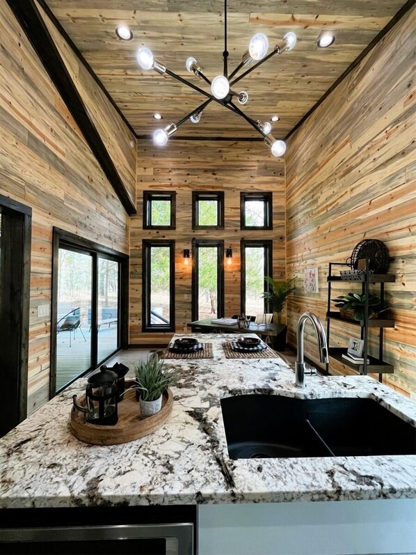 Soho LoftT was custom designed by a well-renowned Dallas architect to take advantage of the surrounding landscape to provide our guests with a unique experience that encompasses both the indoors and outdoors simultaneously. As soon as you enter, the soaring ceilings in unique blue buggy pine give you the feeling of space and the idea that this is not your ordinary cabin. The extensive use of windows and sliding glass doors not only brings the outdoors in but frames the trees to create an almost gallery-like feel inside the cabin and ever-changing art on the walls that feels light and open, like being high in the sky. The see-through fireplace in the living room brings even more light and more openness into the space to allow you to relax and enjoy your much-needed time away.