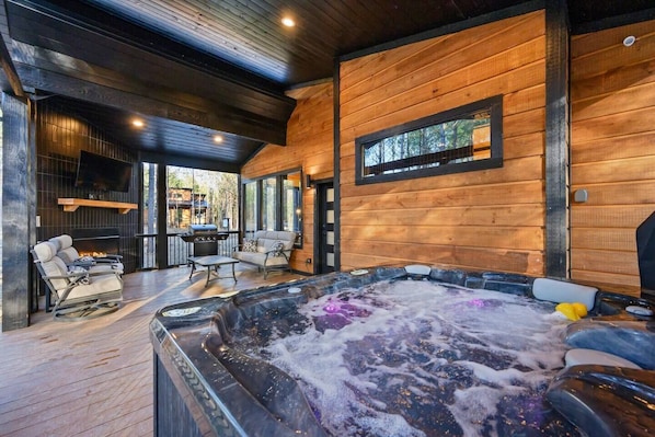 * Covered patio with seating and private hot tub