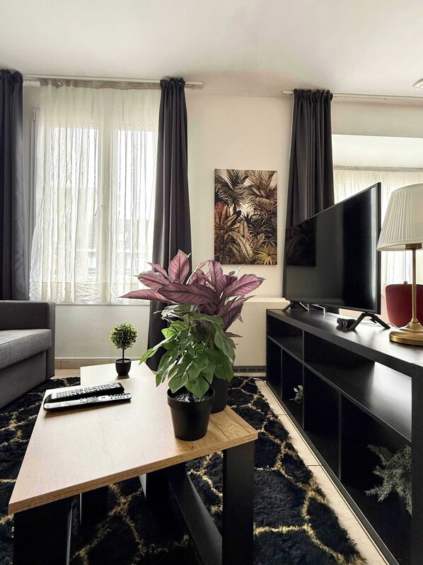 Cozy living room with 140 cm sofa bed, flat-screen TV & stylish dining area