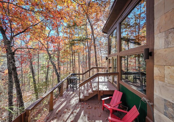 Our Resort property features several outdoor areas for your enjoyment. The Yard is the center of our Resort. There, you can find a gorgeous view, seating, a group fire pit, a bocce ball court, corn hole, ladder ball, horseshoes, and our signature "logzebo" with a bed swing. Additionally, we have an onsite hiking trail that leads to the playground and our Eco Park, which features a waterfall and a custom mountain laurel bridge.