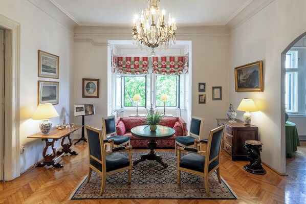 Denne romslige leiligheten (170 m2), med elegant og nøye innredet ligger i det historiske sentrum av Budapest, på den tredje etasje i en vakker gammel bygning med heis, med utsikt over Donau.