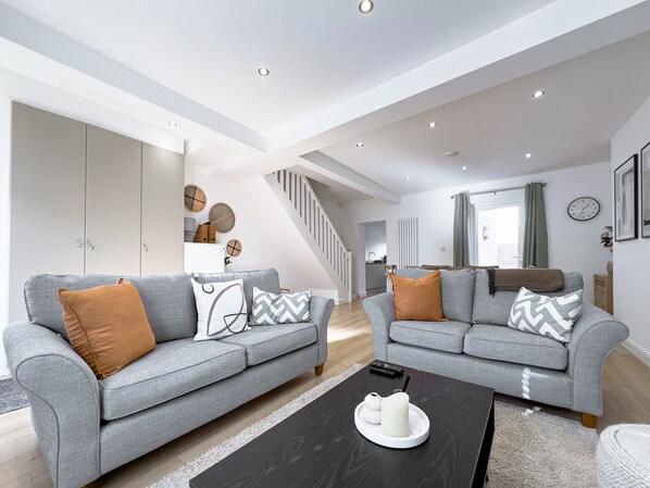 After a day exploring the local area, return to the comfort of our cottage and unwind in the cozy open-plan living area and snuggle up to a movie under one of our thoughtfully provided blankets.