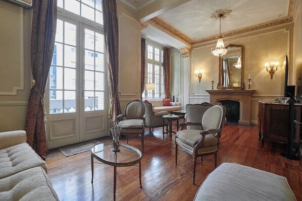 At Welcome2BA, every detail of this Parisian-style apartment is a service designed for you. Rest in two elegant bedrooms with TVs, gather in the grand living room with 12-ft ceilings and 75" TV, or dine in style for six. We ensure comfort with AC in every room, three full baths plus Jacuzzi suite, a fully equipped kitchen with pro appliances, private office, and laundry. Our care transforms each feature into part of a seamless, luxurious experience prepared just for your stay.