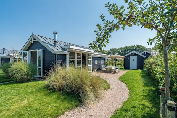 The Duinpark Westerschouwen is located in the Westhoek of Schouwen-Duiveland on the edge of the dunes, beach and sea. There used to be a fruit orchard on this spot, the park was laid out in 2014 with natural materials such as hedgerows, dunes, pool and shell paths. The chalets are rented out in collaboration with the Van der Maas family, initiators of the Duinpark Westerschouwen. The Van der Maas family is the point of contact during the guests' stay, in their cozy farm shop with countless delicious regional products, guests are received for the key transfer.