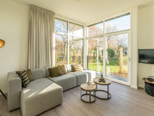 This chalet is surrounded by a sheltered garden with dunes, marram grass and a row of trees. Literal