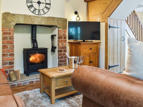 Living/dining room: Smart TV, Woodburner, Patio Doors Leading To Garden