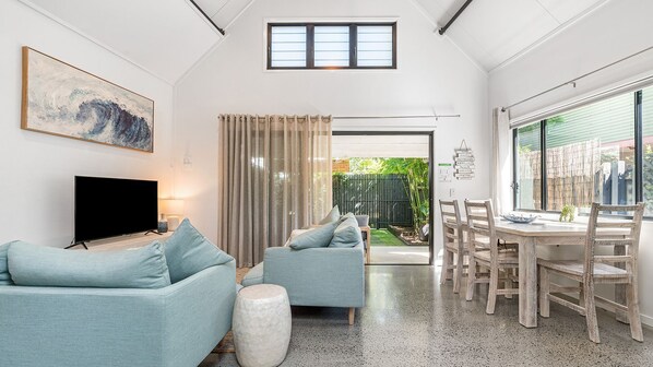 The main house features a dedicated living space separate from the entertainment area where guests can relax on a comfortable corner lounge while enjoying favourite programs. An elegant ornamental fireplace serves as the room's centrepiece, showcasing this beach house's distinguished heritage as one of the area's original properties, now completely restored for contemporary holiday enjoyment.