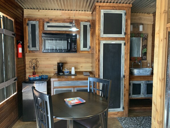 Soveplass til 14, inkluderer 4 hytter tema for å fange essensen av Wichita-fjellene. Hver hytte har en tur i flislagt dusj. Låvtre, knudret furu og bølgeblikk brukes i hver av de romslige hyttene. Mørke beisede betonggulv og tinntak gir virkelig en rustikk, men elegant atmosfære. Nyt solnedgangen fra den lange overbygde verandaen mens du slapper av i tre-vippene. Vi er også begeistret for vårt nyeste tillegg på paviljongområdet med et piknikbord og kullgrill.