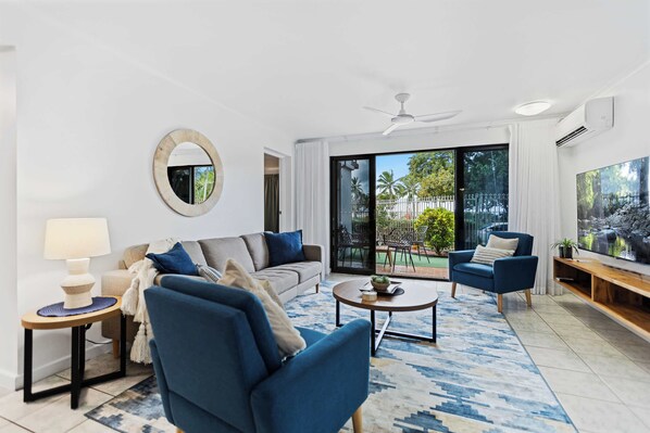 Unwind in a spacious 3-bedroom, 2-bath ground-floor apartment that captures the relaxed spirit of Cairns, reef and rainforest. Designed for families, friends and groups up to 6 guests, it offers fast Wi-Fi, full air-conditioning and a private outdoor oasis.