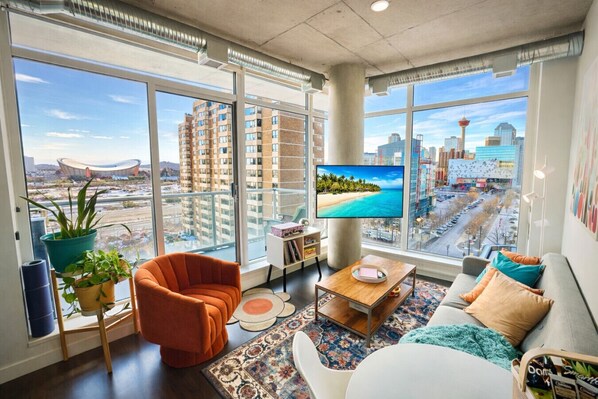 Welcome to our bold, colourful two-bedroom Airbnb in Calgary’s East Village! Featuring dopamine decor, cozy bedrooms, a fully equipped kitchen, and a stylish living area, it’s perfect for unwinding or snapping photos. Step outside to explore top restaurants, shops, and attractions like the Bow River pathway, Studio Bell, and Calgary Tower—all within walking distance. Enjoy vibrant downtown living at its best!