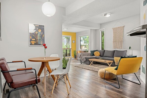 You enter this unique space to feature a geometric mural which matches the energy of this vibrant community. Elegant, spacious and open living space featuring a nice soft shag rug and modern coffee table and a bright comfy yellow chair. The beautiful living room mural was painted by a local artist. Enjoy a restful evening in the living room by resting on a comfy sectional couch wrapped around a throw blanket and enjoying your favorite TV show or movie on the Smart TV that includes Netflix and Disney+; or turn on your favorite tunes on the wireless speaker that also lights up as a lantern. Sectional couch which easily pulls out into a sofa bed for one or two extra guests. Beautiful vinyl plank flooring throughout the spacious living room area, dining room, kitchen and bedroom. Sit down and read a book in a bright sun room situated in front of large bright windows that allow plenty of sunlight into the space surrounded by beautiful green plants.