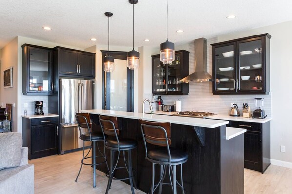 -Kjøkkenet er en kokkerdrøm med rustfrie hvitevarer - dobbelt brennstoff (gasspis, elektrisk ovn), fransk dør kjøleskap og oppvaskmaskin og mikrobølgeovn. Alt du kan tenke på er gitt - inkludert fondue sett for de kalde vinterkvelder tilbake fra ski! Det er nok servise for 12, og plass til 9 ved bord (spisebord (6) og øy (3).