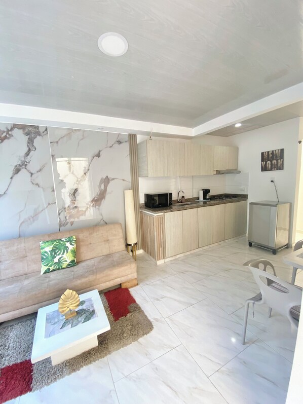 Denne leiligheten har TV og tekjøkken med kjøleskap, kokeplater og kjøkkenøy. Gjestene tilbys dessuten en kaffetrakter/tekoker.