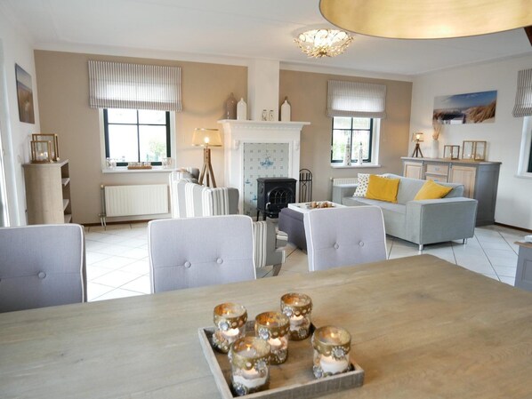 This holiday home is located 900 meters from the beach in a quiet holiday park. The park is only accessible to residents. Available for 5 people and is fully equipped and recently restyled to a modern design. On the ground floor there is the living and dining room, the open kitchen, utility room and hall. Two bedrooms (with box spring beds), a bathroom with bath, separate shower cabin, toilet and bathroom furniture are located on the top floor. There is a large garden with a furnished outdoor terrace (sun-oriented) and is child-friendly (completely fenced). There is also free WiFi available.