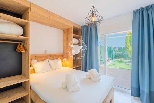 In addition to the indoor living space, your private garden offers a built in charcoal grill and plenty of space to relax. Enjoy a bookyour favorite cocktail while the Mediterranean climate soothes your senses and clears your head. Have you relaxed and want some action? Then you can take a splash in the communal pool and sunbathe in the tropical communal garden.