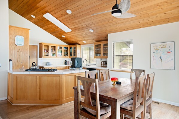3 Bedrooms, 2 1/2 Bathrooms. 1 King, 1 Queen, 1 Double/Twin bunk bed, 1 Twin trundle( 2 twins). 2 Flat screen TV's, Blu-Ray DVD, wireless internet, easy-start, thermostat controlled gas fireplace, sun deck with privacy shades, ocean view outdoor dining, gas BBQ on the deck off of the dining room, double garage, decks, hot tub. This super comfortable house is well cared for and is just a couple blocks down to the ocean, and even closer to the Fiscalini ranch walking trails. This is a split level home. The upstairs is the main part of the house including the master bedroom and bath, kitchen, dining area and living room and a half bathroom. The downstairs consists of the other 2 bedrooms and a full bathroom. The garage has a level 2 EV charger, and there is a computer and a printer in the living room!