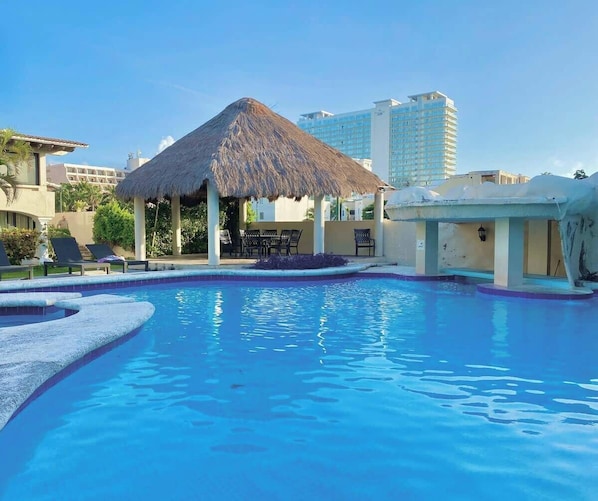 The condominium has 3 different pools which you can use. It is located in the hotel zone, walking distance from a nice public beach. We offer a secure parking place but also if you dont have a car you can take the bus through the hotel zona which you can take right on the main boulevard.