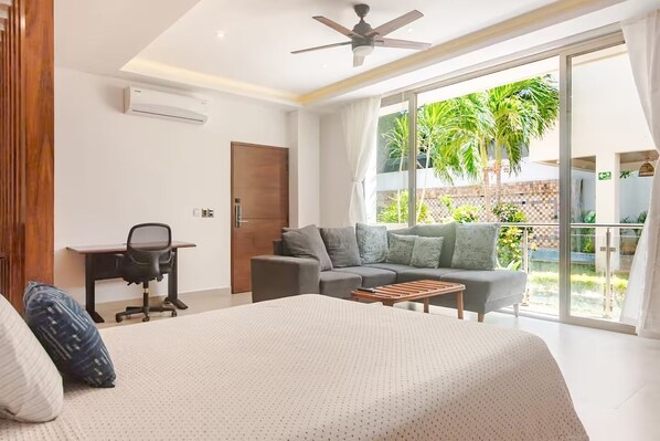 Alle gjesterommene på Akbal Loft on first floor, pool, gym and coworking space_ 101 byr på fordeler i form av klimaanlegg samt fasiliteter som kontorstol og spisebord.