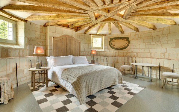 A dream night in a 15th century tower with a breathtaking view of the Château terrace, breathtaking red sunrises and sunsets. It is offered for full privatization only, for one or two rooms.