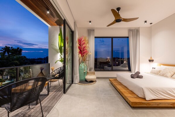 On the 2nd floor you will find the master bedroom + large ensuite bathroom with rice field views while having a bath. For a quick cool off you can use the jungle-style designed rain shower.