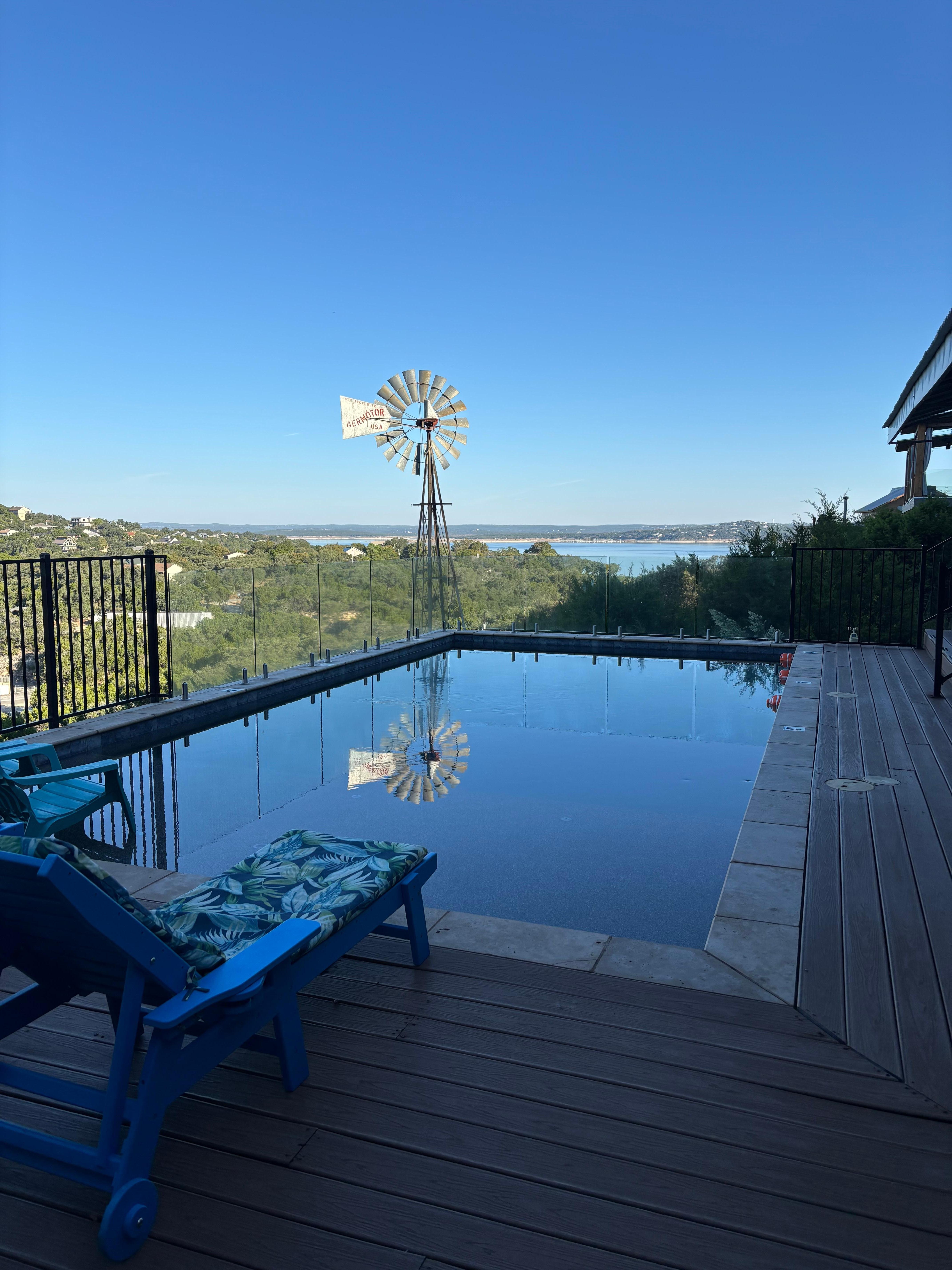 The Canyon Sky deck is the perfect place to enjoy a cup of coffee in the morning and watch the sun rise across the lake. At night, sit back with a glass of wine and watch the Milky Way appear as the moon reflects off the water of the lake. Sit at the bar made of repurposed wood from a 1940's wooden hospital in Seguin & enjoy a beverage. Enjoy the 2nd story private saltwater pool overlooking the lake for a swim!