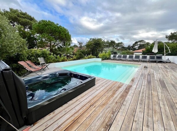 Du vil sette pris på de store karnappvinduene som vender ut mot en romslig terrasse med svømmebasseng, utedusj, plancha og grill. Øst og sør eksponering.