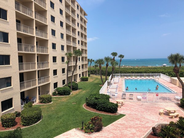 På stranden og med utendørsbasseng og beliggenhet nær Cocoa Beach molo