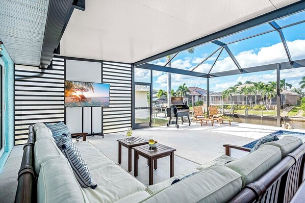 A private lanai awaits you for sunbathing, grilling, lounging, al fresco dining, entertaining, or swimming in the heated pool. You can fish right off the dock or simply watch the boats pass by. The BBQ grill invites you to cook outdoors and enjoy the Florida sun. With your private boat dock, you can unwind by the water — making this exquisite home the perfect destination for an unforgettable getaway. Whether you're relaxing poolside or watching the moonlight reflect on the water, this home offers a blend of coastal comfort and timeless beauty.