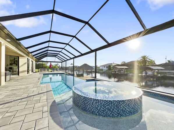 The waterfront home of Villa Royal Palm is a four-bedroom, four-bathroom home in Cape Coral for eight guests. The single-level home features neutral colors that fade away against lush tropical vegetation in bold green. A covered patio holds the entrance to the home and a soaring roof. Make yourself at home, then head outside to your outdoor oasis. The fully screened-in area boasts an in-ground pool with partial zero-edge and spillover spa. At one end of the pool is a deck with adjustable chaise lounges to enjoy a sunny Florida day, as well as an outdoor shower too rinse off before heading back inside. Under the covered patio, you'll find a BBQ grill for cooking up favorite foods and an outdoor dining set that seats the whole group. A large outdoor living set seats where everyone can relax and spend time together. The door at the other end allows easy access to the private dock and tiki hut with seating. Launch a kayak or tie up a boat for fun water sports.