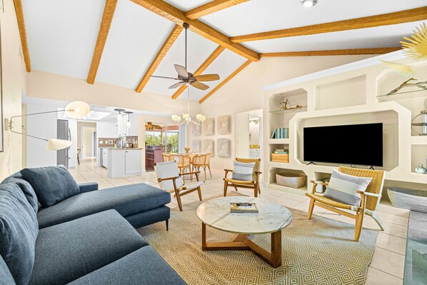 Inside, the light-filled interior is just as inviting. Stretch out and enjoy the living room's ample seating and large smart TV. Prepare tropical treats amidst the full kitchen's gleaming countertops and stainless steel appliances. And indulge in family-style meals at the dining room's formal dining table.