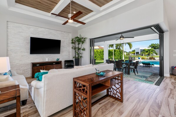 The large sliding glass doors of the living room not only provide access to the lanai and pool, but also provides plenty of light. The living area has a sizeable, comfortable sitting area for a relaxed TV, board or card game evening. The large, internet-enabled TV is perfect for your entertainment experience.