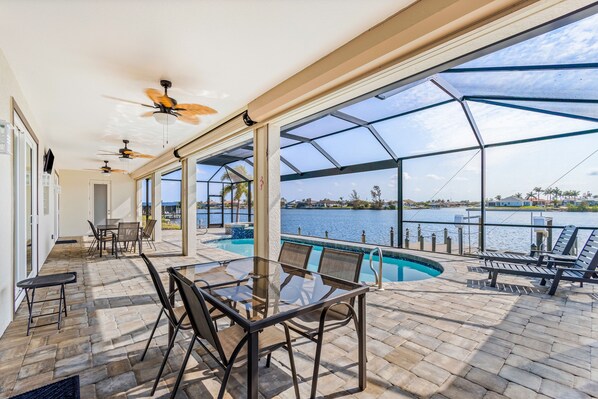 Greet each day with a beautiful sunrise over the canal and wide-open views of Florida's sunny skies at this waterfront home in Cape Coral. This is a place to live your life outdoors, whether you're swimming in the private pool out back or dangling your feet from the dock at the water's edge.