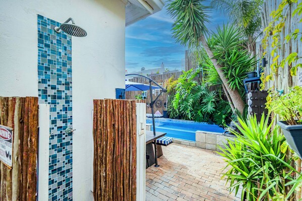 As you walk through the right door, you’ll find a covered area and a cabinet to hold the outdoor cushions/chairs. You’ll continue along the right side (doors to Buffalo and Giraffe are located here), with a wall filled with grape and passionfruit vines, lemongrass plants and a variety of vegetables including peppers, tomatoes, lettuces and herbs (when in season). Here you’ll also find a small cushioned bench and a few cabinets with braai supplies and pool toys along with a braai (BBQ). Just before entering the back garden area, we have an outdoor shower for a quick rinse after a day at the beach or pool. The back courtyard is a great entertaining and relaxing space. The picnic table with cushions offers seating for 12 people with an umbrella and even has a built-in electrical outlet. The 100sqft pool (9.3sqm) is 5ft (1.5m) at its deepest point with graded steps from the side and enough room for 12 people. As a half-above ground pool, you can easily step over the glass wall for access to an internal bench with seating for up to 6 people. Surrounded by lush greenery including palm trees and monsteras, the beach palette of wooden chairs with black potted plants and mirrors scattered across the walls. An Amazon Echo is situated in the corner to play music while relaxing. Along the side and in the back pool area there are 2 cameras to ensure safety and security in these areas.