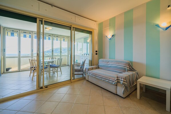 The recently renovated apartment, of approximately 43 m2, is composed of a living room with kitchenette, double bed and double sofa bed; bathroom with shower. To complete the apartment, there is a terrace/solarium with windows and a splendid sea view. The apartment is equipped with TV, private parking included, shared barbecue and swimming pool.
